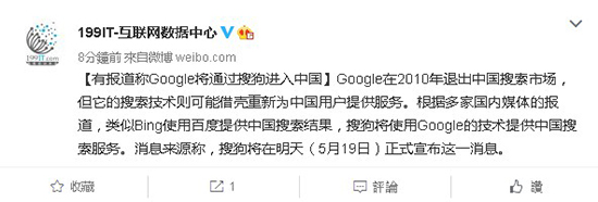 然而,5月19日上午,搜狗搜索官博正式宣布與微軟必應(yīng)達(dá)成合作,打破了谷歌返華的幻覺(jué)。按官方說(shuō)法,搜狗搜索使用微軟的英文搜索技術(shù),推出英文搜索和學(xué)術(shù)搜索兩個(gè)垂直頻道,讓用戶便捷地獲取權(quán)威、全面、精準(zhǔn)的英文資訊和學(xué)術(shù)資料。