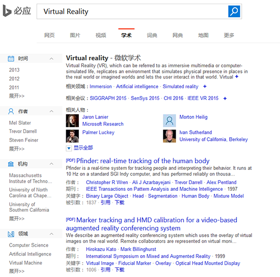 經(jīng)測(cè)試,在搜狗學(xué)術(shù)和必應(yīng)學(xué)術(shù)里輸入關(guān)鍵詞Virtual Reality,兩者呈現(xiàn)的內(nèi)容和形式是一樣的。對(duì)于想尋找國(guó)外論文資料的人,兩者都能提供很好的搜索結(jié)果,都涉及不同專業(yè)領(lǐng)域的作者、機(jī)構(gòu)和期刊內(nèi)容。