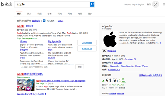 在英文搜索里輸入apple,必應(yīng)搜索排名第一的是蘋(píng)果官網(wǎng),緊接著是關(guān)于蘋(píng)果的最新資訊,右欄則是蘋(píng)果的維基百科和股票行情。相比之下,搜狗搜索排名第一的是蘋(píng)果香港官網(wǎng),不過(guò)整頁(yè)都沒(méi)有蘋(píng)果的最新資訊。如果是想關(guān)注國(guó)外資訊的話,搜狗英文搜索不如必應(yīng)搜索便捷。