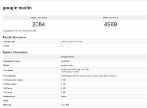 近日,一款代號為Nexus Marlin的新機登陸了跑分網(wǎng)站Geekbench。數(shù)據(jù)顯示,Marlin單核成績?yōu)?084分,多核成績?yōu)?969分,將搭載四核1.59GHz處理器,采用4GB RAM,預裝谷歌最新的Android 7.0操作系統(tǒng)。