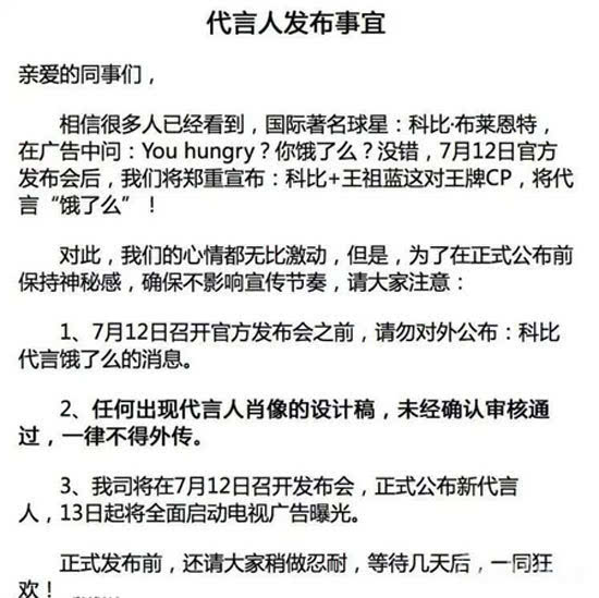 近日有餓了么內(nèi)部員工爆料,國際籃球巨星科比布萊恩特即將代言餓了么(其實這廣告在小編家小區(qū)已經(jīng)上線數(shù)日),從曝光的廣告海報中可以清晰看到,科比的廣告詞是“you hungry?”。此外,還放出疑似餓了么的內(nèi)部截圖,截圖上顯示7月12日餓了么將舉行官方發(fā)布會,屆時將宣布科比+王祖藍(lán)這對王牌CP代言“餓了么”。