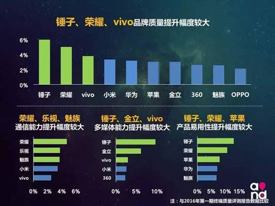 在不久前結(jié)束的“2016年中國(guó)移動(dòng)全球合作伙伴大會(huì)”期間,中國(guó)移動(dòng)終端公司對(duì)外正式發(fā)布《中國(guó)移動(dòng)2016年終端質(zhì)量報(bào)告(第二期)》,基于中國(guó)移動(dòng)終端實(shí)驗(yàn)室8億用戶網(wǎng)絡(luò)數(shù)據(jù)、280萬(wàn)條終端測(cè)試數(shù)據(jù),對(duì)19個(gè)品牌71款手機(jī)的整機(jī)評(píng)測(cè)排名顯示,蘋果、華為、Moto分列品牌質(zhì)量前三,小米則未能入圍品牌質(zhì)量前十。
