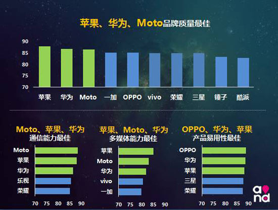 在通信能力部分,Moto、蘋果、華為分列前三;多媒體能力方面,排名前三的分別是蘋果、Moto和華為;至于產(chǎn)品易用性,OPPO、華為、蘋果排名前三名;而用戶口碑的維度上,國(guó)產(chǎn)手機(jī)大獲全勝,其中3000元以上用戶口碑得分TOP3均為華為手機(jī)。