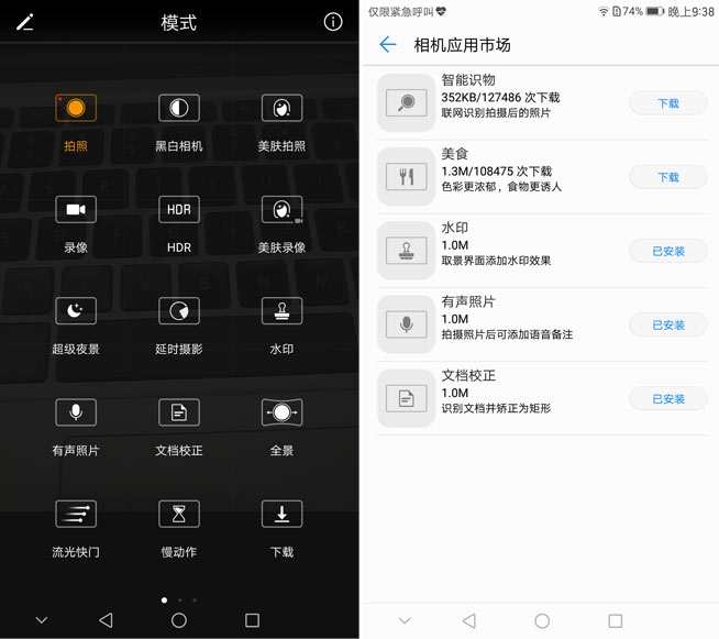 拍照無疑是華為P9 Plus的一大賣點(diǎn),EMUI 5.0總體上保留了原內(nèi)置拍照軟件的體驗(yàn),對一些細(xì)節(jié)功能的入口進(jìn)行微調(diào),并且新增了拍攝模式的下載功能,比如下載調(diào)用吃貨們大愛的美食模式,能讓拍出來的食物色彩更濃郁,達(dá)到更誘人更適合曬圖的目的。