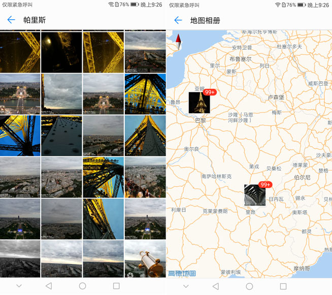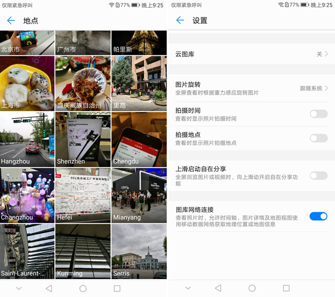 與拍照關(guān)聯(lián)度很高的相冊功能,EMUI 5.0專門增加名為“發(fā)現(xiàn)”的管理方式,通過照片的位置信息以及云算法(需開啟云圖庫功能),可將用戶的照片按照面孔、地點(diǎn)、風(fēng)景、美食、文檔等歸類進(jìn)行整理,方便了用戶在拍攝海量照片后也能快速定位自己所需的素材內(nèi)容。