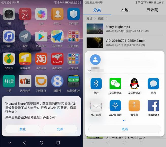 EMUI 5.0新增Huawei Share快速文件分享功能,可在兩臺支持該功能的華為手機(jī)中實(shí)現(xiàn)更快捷的數(shù)據(jù)互傳。由手機(jī)下拉通知找到Huawei Share即可激活,此時(shí)會(huì)同時(shí)開啟手機(jī)的WiFi和藍(lán)牙功能,然后選擇需要傳輸?shù)膬?nèi)容點(diǎn)擊Huawei Share分享,搜索到要發(fā)送過去的設(shè)備后確認(rèn)即能開始傳輸,體驗(yàn)與iOS系統(tǒng)的AirDrop功能類似。從實(shí)測的表現(xiàn)來看,用P9 Plus向Mate 9發(fā)送85.16MB的電影文件,耗時(shí)僅13秒,比傳統(tǒng)藍(lán)牙傳輸快了100倍以上。