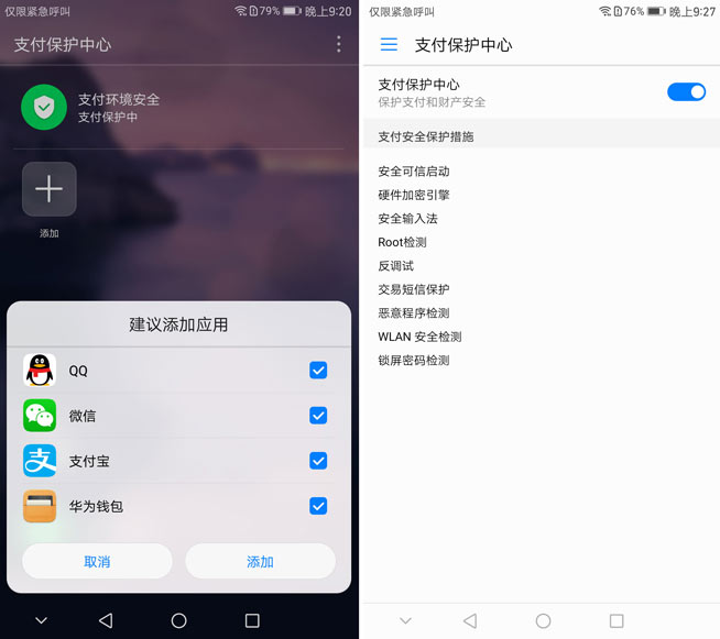 升級EMUI 5.0之后P9 Plus的桌面新增了下載、查找我的手機(jī)、支付保護(hù)中心三個(gè)應(yīng)用圖標(biāo),后兩個(gè)都是針對手機(jī)安全的升級完善,支付保護(hù)中心允許用戶把QQ、微信、支付寶、華為錢包等可能較多涉及到支付交易的應(yīng)用專門放置到手機(jī)獨(dú)立創(chuàng)建的應(yīng)用運(yùn)行空間中,通過雙隔離技術(shù)實(shí)現(xiàn)隔離惡意程序、木馬、病毒等侵?jǐn)_。成功操作后完全不會(huì)影響用戶對相關(guān)應(yīng)用的操作,透過程序圖標(biāo)右下角顯示的小盾牌標(biāo)志可直觀了解當(dāng)前應(yīng)用是否有支付保護(hù)中心的防護(hù)。