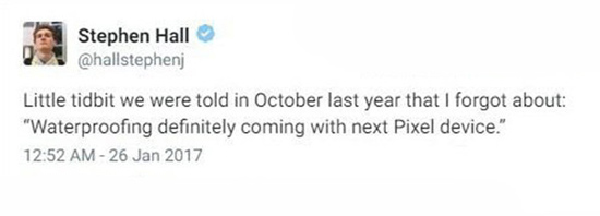 外媒9to5Google主編Stephen Hall在推特上表示,谷歌的下一代Pixel手機(jī)將會(huì)加入防水功能。