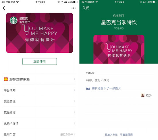 科客體驗(yàn)后發(fā)現(xiàn),請(qǐng)朋友喝咖啡對(duì)應(yīng)的是贈(zèng)送對(duì)方飲料券,目前可選當(dāng)季特飲、拿鐵、焦糖瑪奇朵、摩卡、馥芮白、卡布奇諾六種飲品,均為大杯,有效期三年,可在中國(guó)大陸境內(nèi)的星巴克門店(部分門店除外)兌換指定商品,價(jià)格從31元至39元不等;至于星禮卡即電子版的星禮卡(儲(chǔ)值卡),從50元至500元不等,有效期也是三年,可多次使用消費(fèi)。通過微信無論選購(gòu)咖啡兌換卡或星禮卡都將自動(dòng)存入受贈(zèng)方的微信卡包中,方便快速調(diào)用。