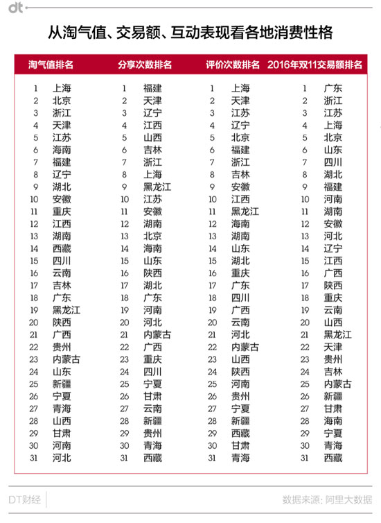 在2016年雙11交易額排行榜上,廣東當(dāng)仁不讓地位居榜首。然而在全國“淘氣值”排名當(dāng)中,廣東卻跌出前10,僅僅排名18,究其原因并非廣東消費(fèi)者購買力下降,主要和廣東人“財(cái)不外露”的低調(diào)性格有關(guān)。這里的人愛買,但不愛曬圖、曬評價(jià)。要是買了什么好東西,也自己知道就好。除非別人問起,否則絕不主動“分享寶貝”給其他朋友。
