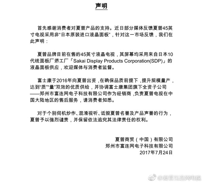 夏普電視辟謠:在售45寸電視均為日本液晶面板