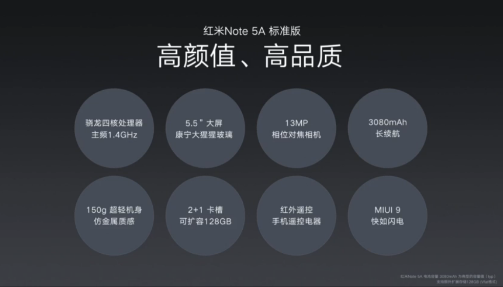 其它方面,紅米Note 5A配備康寧大猩猩玻璃,標(biāo)準(zhǔn)版是最高主頻為1.4GHz的四核高通驍龍425處理器,2GB存儲+16GB存儲空間,配備1300萬像素攝像頭(三星或OV感光元件),電池3080mAh,提供雙卡雙待+micro SD卡的2+1卡槽支持,最高可擴(kuò)展128GB存儲空間,8月底可升級MIUI 9。