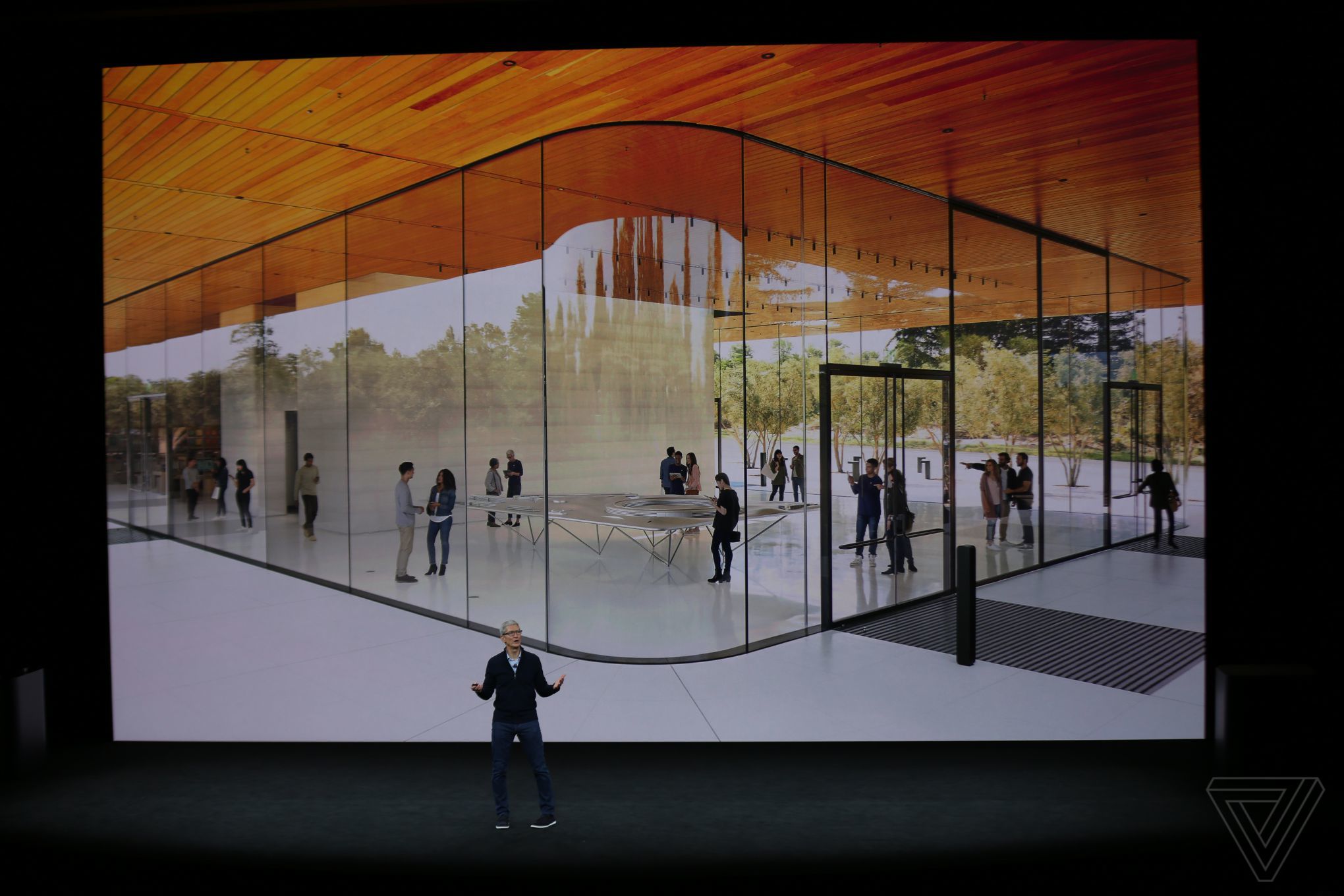 隨后庫克談到蘋果的新家Apple Park(飛船總部),這里占地175公頃,種植了多達(dá)9000顆樹,100%使用再生能源打造,除了Apple零售店之外還有專門的AR體驗(yàn)區(qū)、會客區(qū)。