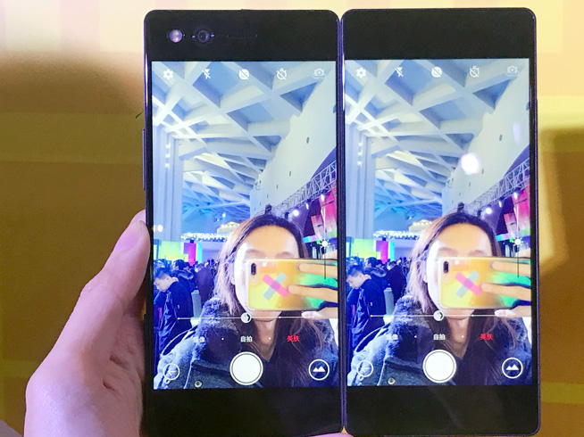 在鏡像模式下,Axon M將機(jī)身開合至60度左右,手機(jī)能夠橫向固定在平面上,此時(shí)無論自己還是與對面的朋友一同欣賞手機(jī)的圖片、視頻,演示PPT都很方便。另外該模式用于給朋友拍照也更加實(shí)用,被拍攝者也能實(shí)時(shí)看到同步取景的畫面,給予拍攝者改善建議,這樣一來MM們以后再也會少了抱怨男友給自己拍照不好看了。
