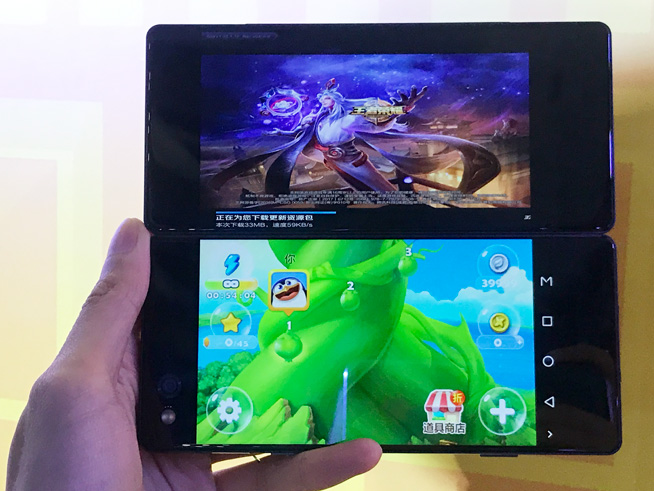 Axon M的雙屏用于游戲與娛樂同樣是加分項(xiàng),一個(gè)屏看視頻或視頻聊天,另一個(gè)屏還能輕松進(jìn)行其它應(yīng)用的操作,帶來的是如同電腦版的方便。此外Axon M還能雙屏同時(shí)玩一款游戲或者兩款游戲,中興軟件團(tuán)隊(duì)還專門為其開發(fā)了兩款虛擬手柄,直接在一塊屏幕上顯示,玩起《王者榮耀》就不再需要在主畫面上進(jìn)行操控,視野開拓之余操控也更加得心應(yīng)手。