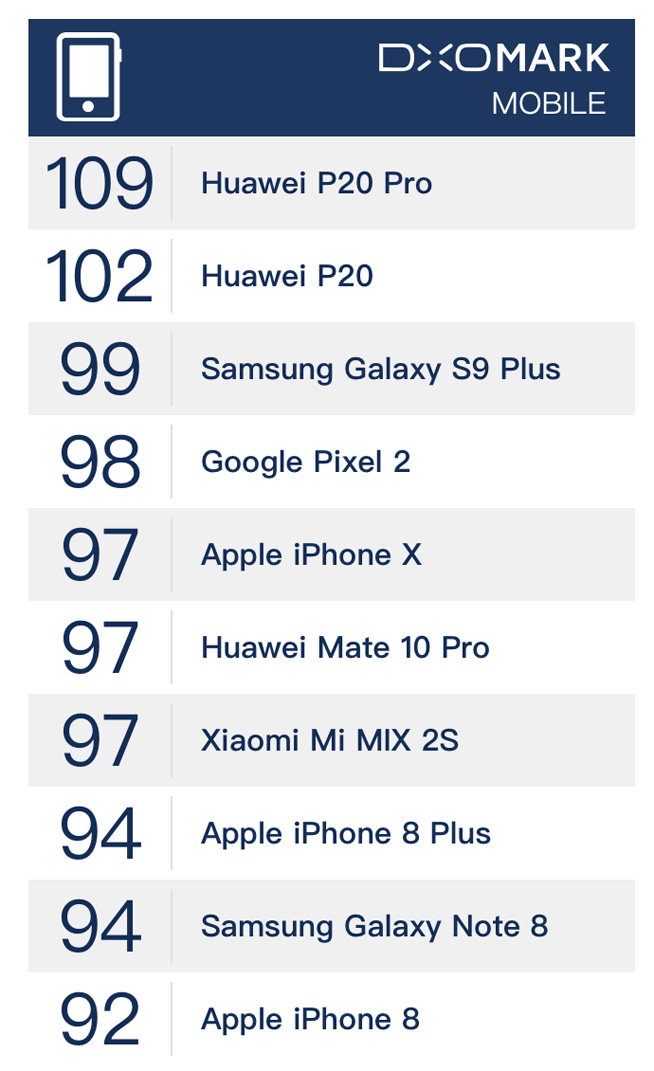 正當蘋果和三星最近兩年也終于跟上雙攝大潮,近日華為又搶先一步,在旗艦新機P20 Pro身上搭載史無前例的后置徠卡三攝方案,開啟了手機攝影技術再次騰飛的一扇大門。盡管科客君還未詳細評測華為P20 Pro,但從專業攝影評測機構DxOMark給出高達109分的綜合測試成績來看,搭載后置徠卡三攝的華為P20 Pro已經勝出現有的雙攝機型一大截,包括此前在DxOMark手機攝影排行榜中名列前茅的三星Galaxy S9 Plus(99分)以及有口皆碑的iPhone X(97分)。
