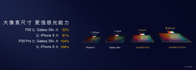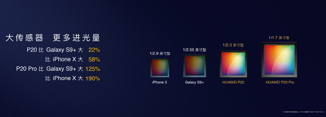 華為P20 Pro得以重新定義手機影像系統,與三枚徠卡鏡頭的協同作用密不可分,當中很關鍵的主攝“底大一級壓死人”,余承東在發布會上用這樣一句攝影人士皆知的通俗語言道出真相。具體來說,華為P20 Pro的主攝像頭傳感器面積達到超大的1/1.7英寸,達到近年主流手機的最大傳感器規格。作為對比,三星Galaxy S9+和蘋果iPhone X的傳感器分別為1/2.55英寸及1/2.9英寸,華為P20 Pro的傳感器面積比S9+大125%,比iPhone X更是大了190%。傳感器尺寸的增加,意味著單像素的捕捉光線能力更強,同樣環境下,可以拍攝出亮度更高、噪點更少、更清晰的照片。