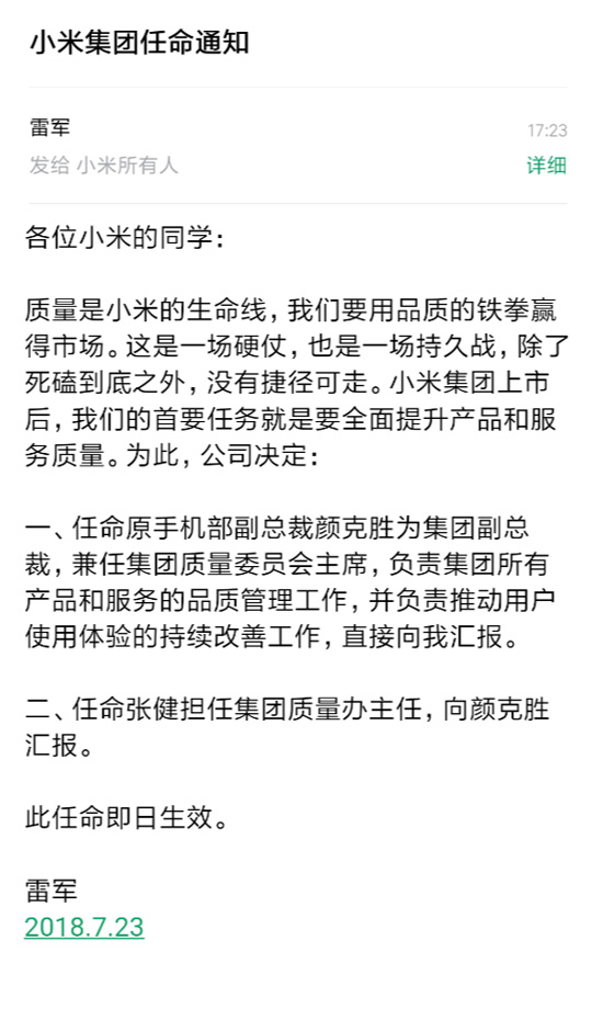 7月23日,小米集團(tuán)在香港成功上市的第三周,小米集團(tuán)董事長雷軍發(fā)布內(nèi)部信宣布兩項新的人事任命,即日起生效。根據(jù)新的任命,原手機部副總裁顏克勝為集團(tuán)副總裁,兼任集團(tuán)質(zhì)量委員會主席,負(fù)責(zé)集團(tuán)所有產(chǎn)品和服務(wù)的品質(zhì)管理工作,并負(fù)責(zé)推動用戶使用體驗的持續(xù)改善工作,直接向雷軍匯報。與此同時任命張健擔(dān)任集團(tuán)質(zhì)量辦主任,向顏克勝匯報。