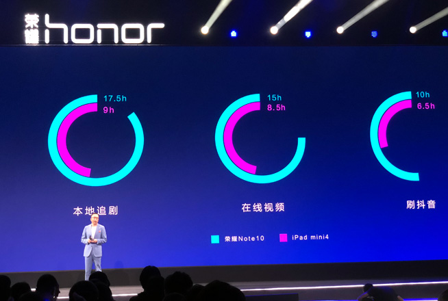 在GPU Turbo和CPU Turbo全開的極限環境下,榮耀Note 10連續玩荒野行動續航4.5小時、王者榮耀6.5小時、刺激戰場5小時。若在正常情況下使用,本地追劇續航可達17.5小時、在線視頻15小時、刷抖音10小時,號稱比iPad mini更持久。