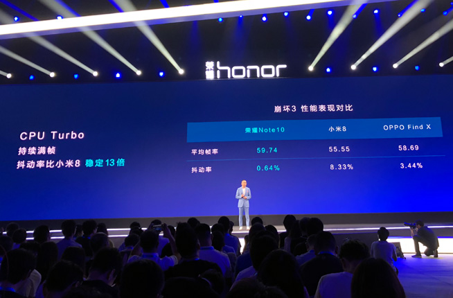 除了“很嚇下人的技術”GPU Turbo加持之外,榮耀Note 10還首度采用CPU Turbo技術,可通過機身側面的專用Turbo按鍵切換至CPU全速運行?,F場榮耀專門提供了幾款熱門手機玩《崩壞3》的測試數據,榮耀Note 10可持續滿幀,抖動率比小米8穩定13倍。