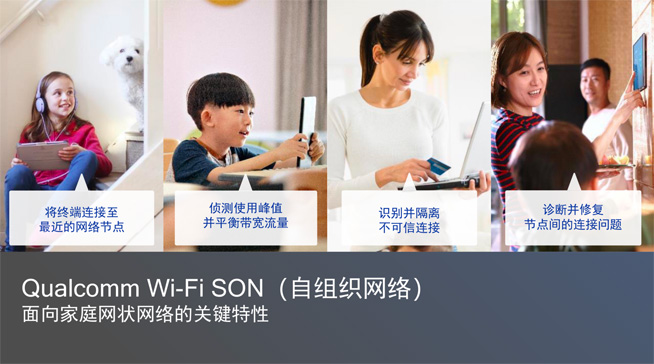 從目前國內(nèi)家庭聯(lián)網(wǎng)終端越來越多、智能家居普及化的趨勢來看,家庭用戶在高密度網(wǎng)絡(luò)情況下對網(wǎng)絡(luò)體驗(yàn)需求迫切需要提升,可以預(yù)見能顯著解決以上存在問題的網(wǎng)狀網(wǎng)絡(luò)WiFi未來將有著非常大的增長空間。Qualcomm WiFi Son(自組織網(wǎng)絡(luò))作為領(lǐng)先的網(wǎng)狀網(wǎng)絡(luò)解決方案,擁有自配置、自管理、自修復(fù)、自防御的四重特性,支持藍(lán)牙和ZigBee接入,如今還集成了更多智能語音控制的能力,有助于智能家居產(chǎn)品實(shí)現(xiàn)更豐富的聯(lián)動,據(jù)悉WiFi Son還在研發(fā)空間的AI感知能力,以拓展更多新場景的應(yīng)用。