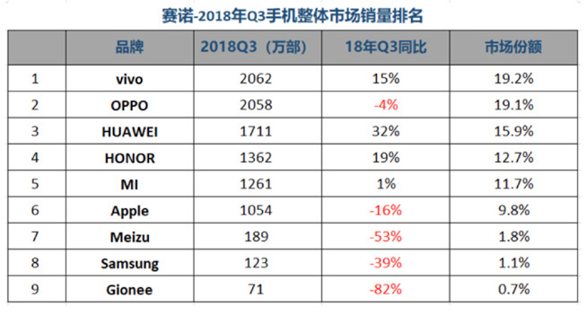 賽諾的數(shù)據(jù)還顯示,進(jìn)入第三季度以來(lái)中國(guó)手機(jī)市場(chǎng)縮減的趨勢(shì)仍在繼續(xù),9月的市場(chǎng)容量同比下滑達(dá)到7.7%。Q3蘋(píng)果恰好處在新品迭代期,銷(xiāo)量同比下滑16%,隨著三款新iPhone全面發(fā)售,預(yù)計(jì)下個(gè)季度會(huì)有搶眼表現(xiàn)。值得注意的是,同屬第二梯隊(duì)的三星、魅族,第三季度均出現(xiàn)慘不忍睹的銷(xiāo)量暴跌,分別高達(dá)39%和53%,至于更慘的金立下滑幅度達(dá)82%,鑒于其現(xiàn)狀其實(shí)已無(wú)力回天。