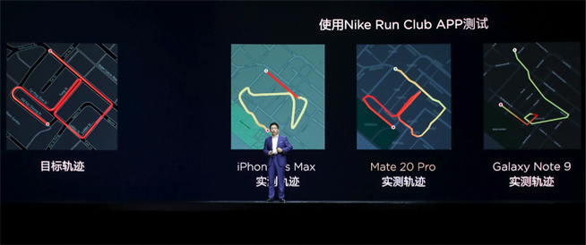 在華為Mate 20中國發(fā)布會(huì)現(xiàn)場,華為消費(fèi)者業(yè)務(wù)CEO余承東分享了用Mate 20 Pro手機(jī)與蘋果iPhone XS Max、三星Note 9在城市高樓密集的街區(qū)進(jìn)行定位對比的成績。通過Nike Run Club APP紀(jì)錄運(yùn)動(dòng)軌跡,華為Mate 20 Pro全程運(yùn)動(dòng)下來的實(shí)測軌跡與目標(biāo)軌跡高度吻合,iPhone XS Max則在中后段出現(xiàn)較大偏差,至于Note 9更是幾乎大半段都在漂移,軌跡隨便就飄到了附近的街區(qū),誰優(yōu)誰劣一目了然。