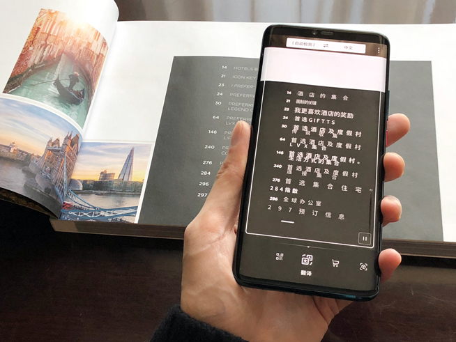 以本人在用的華為Mate 20 Pro為例,AR翻譯功能只需開啟相機(jī)后點(diǎn)選左上角的圖標(biāo),即進(jìn)入智慧視覺界面,此時(shí)共有四項(xiàng)模式可選,包括掃碼、翻譯、購物、識物,其中的翻譯便對應(yīng)了新增的AR翻譯。遇到需要翻譯的文字內(nèi)容,只需將手機(jī)鏡頭盡量平整對準(zhǔn)內(nèi)容信息,Mate 20 Pro在短時(shí)間內(nèi)就能給出對應(yīng)的翻譯文字同步顯示在畫面上,實(shí)現(xiàn)隨看隨譯。