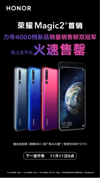 11月6日上午10:08,榮耀Magic2開啟首銷,線上線下的表現(xiàn)近乎瘋狂,在線上榮耀Magic2剛開售即宣告售罄,勇奪4000元檔新品銷量和銷售額的雙冠軍。另一端,在線下也出現(xiàn)了久違的排隊購機場景,要知道上一個在國內(nèi)掀起排隊盛景的是華為系列,此次,榮耀Magic2也算緊追“老大哥”的步伐,在國內(nèi)市場踏出了堅實一步。