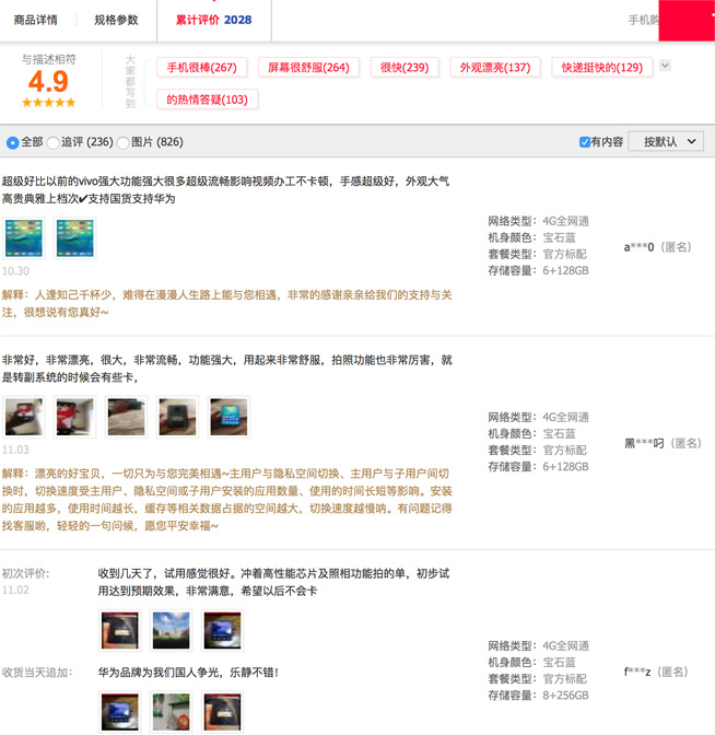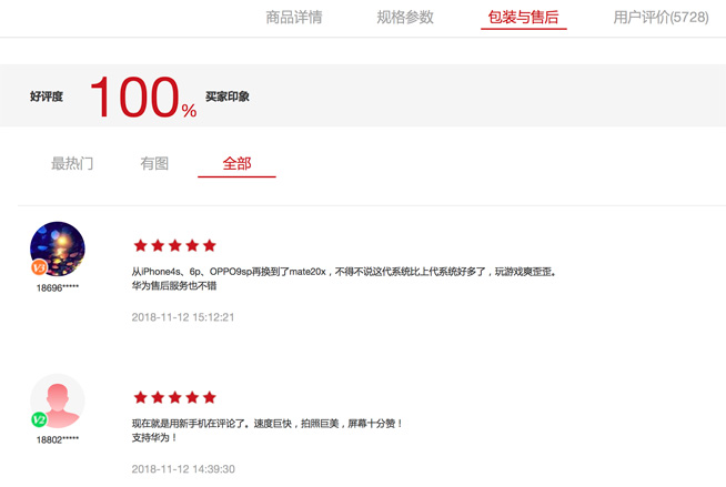 再看看天貓平臺(tái),華為Mate 20 X收獲了幾乎全五星的評(píng)價(jià),好評(píng)率達(dá)到4.9分,評(píng)價(jià)的主要標(biāo)簽包括“手機(jī)很棒”、“屏幕很舒服”、“很快”、“外觀漂亮”,另外用戶紛紛點(diǎn)贊其電池大、玩游戲不燙。