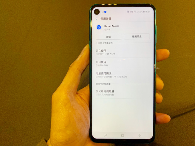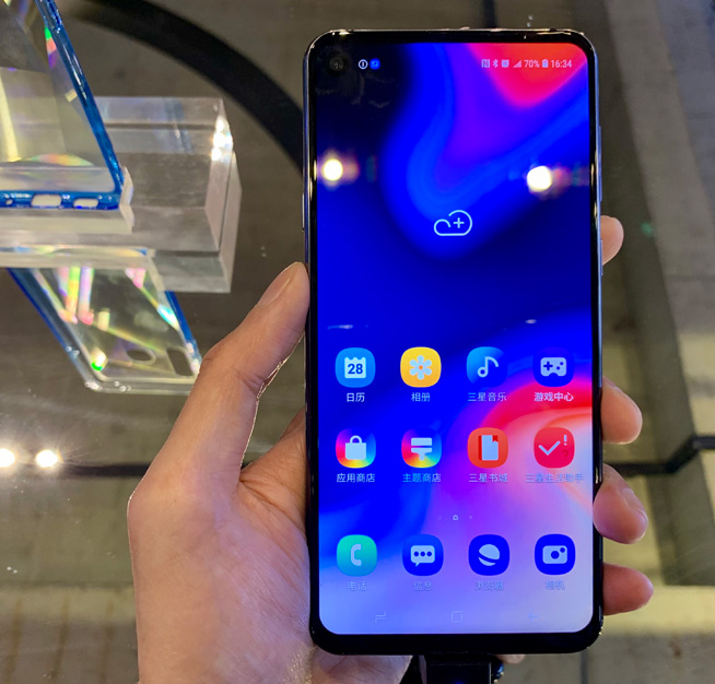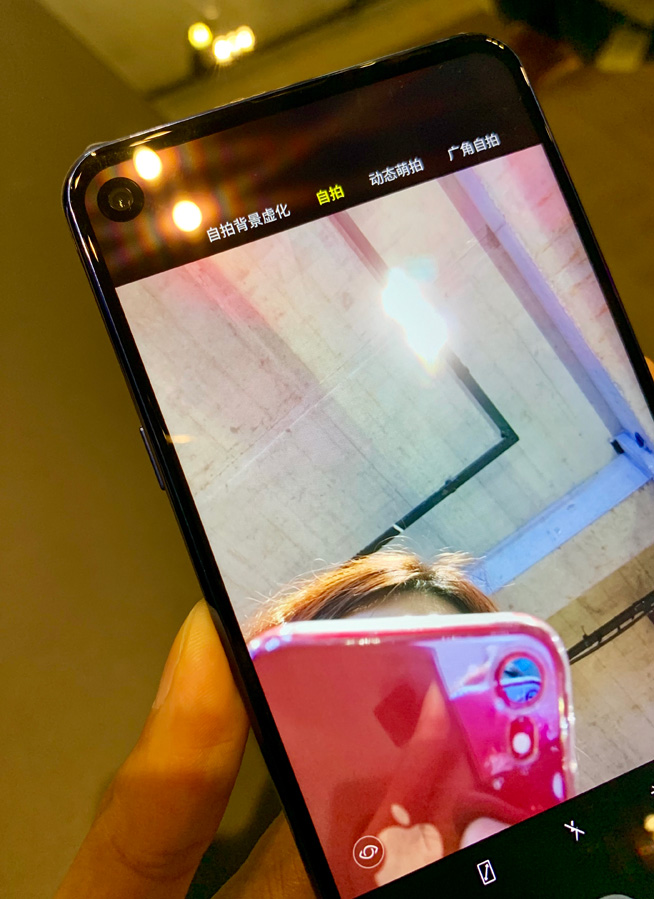 就科客君上手體驗的三星Galaxy A8s真機來看,前置鏡頭放在屏幕左上頂角,由于屏幕物理開孔的存在,手機的UI狀態欄有進行專門的調整,當然功能方面還是完整,前攝除了自拍用途之外還借此實現人臉識別解鎖功能。Galaxy A8s表面還是一塊完整的玻璃,在黑色顯示背景下其屏內攝像頭并不會產生突兀感,效果就如iPhone劉海屏與黑色背景更配那樣,只不過在白色背景下這枚不大不小的前攝就有些許“搶鏡”了。