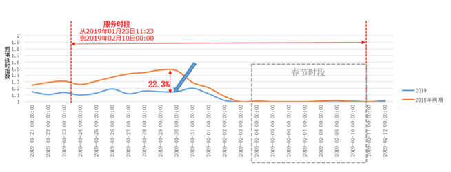 以宣城宣廣樞紐路段為例, 根據(jù)歷史數(shù)據(jù)顯示宣廣樞紐東向西易發(fā)擁堵,為此宣城交警在春運(yùn)期間(2019年01月23日-2月10日)通過(guò)“交警推薦”功能規(guī)劃避堵路線,推薦用戶繞行G50滬渝高速。根據(jù)監(jiān)測(cè)數(shù)據(jù)顯示,期間宣廣樞紐路段全天擁堵延時(shí)指數(shù)無(wú)明顯峰值,較2018年同時(shí)期,全天擁堵延時(shí)指數(shù)大幅下降,最大全天擁堵延時(shí)指數(shù)下降22.3%。