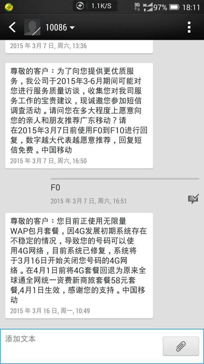 有著和科客君類似遭遇的移動用戶,其實都屬于中國移動至少6年以上的老用戶,約有256萬戶的規(guī)模,早年曾以每月10元、20元或36元的價格開通WAP包月套餐業(yè)務(wù),科客君訂購的便是動感地帶的“20元GPRS月套餐32004”。在移動發(fā)展4G的階段,卻將這批忠實用戶視為“隱患”和“釘子戶”,通過各種手段在2015年初清理至70萬戶左右。多年來,即便國家多次要求運營商執(zhí)行提速降費,即便這批用戶通過各種方式或渠道投訴,移動仍舊視而不見,公然無視廣大消費者的權(quán)益。