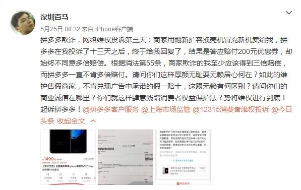 深圳劉先生在拼多多平臺買了iPhone 7 Plus,但卻發現這款手機屬于翻新機,維權困難。