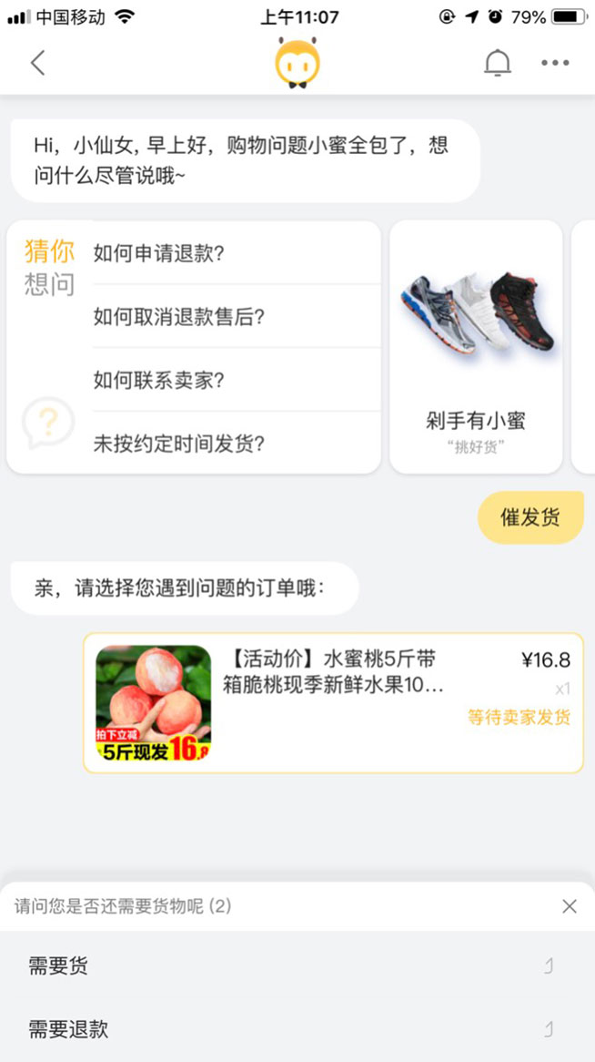 “跑腿小蜜”專門針對消費者大促后最關心的問題設計解決方法,只要打開手淘頁面的“客服小蜜”,直接對小蜜說一聲“催發(fā)貨”,就可以收到所有未發(fā)貨訂單進行選擇,無論“需要貨”或是“需要退款”都可以一鍵觸發(fā),跑腿小蜜就會快馬加鞭把選中的訂單加上消費者訴求直達商家端,并在24小時內(nèi)獲取商家的解決方案和處理進度反饋給消費者,秒秒鐘跑完流程。