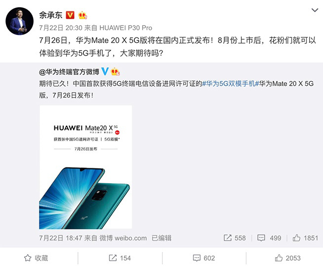 國內(nèi)5G網(wǎng)絡(luò)有了,5G手機到底何時上市?相信這是很多朋友都在持續(xù)關(guān)注的問題,7月22日晚,華為終端官方微博宣布,將于7月26日發(fā)布華為Mate 20 X(5G)手機,隨后華為消費者業(yè)務(wù)CEO余承東轉(zhuǎn)發(fā)微博并透露,這款5G手機將于8月正式上市。