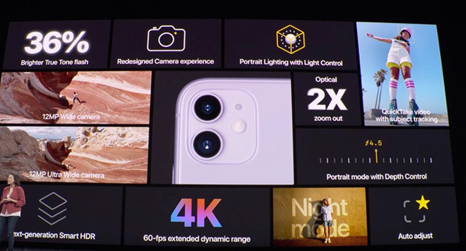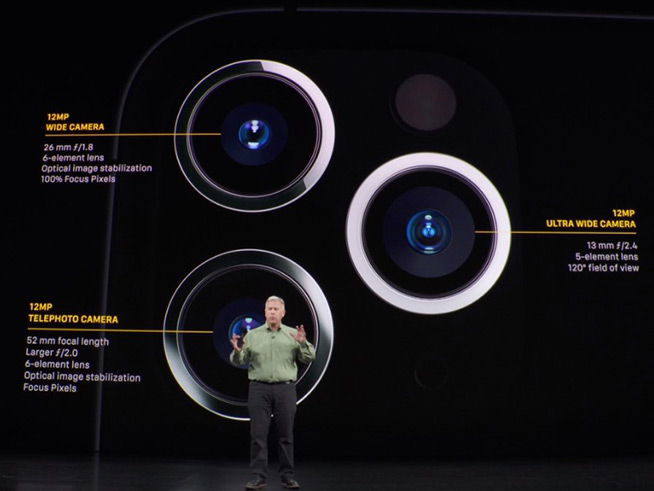 采用三攝系統(tǒng)的iPhone 11 Pro和11 Pro Max,三枚鏡頭分別是廣角、超廣角和長焦的組合,均為1200萬像素,覆蓋從0.5x至2x的焦段攝影,換句話也可以說是4倍變焦,只不過是從超廣角焦段開始計算;若計算光學(xué)變焦的話,則是2倍,兩款機型均支持多達10倍數(shù)碼變焦。另外,用戶期待已久的夜間模式也終于加入。