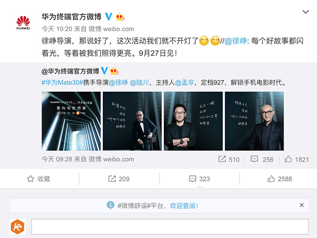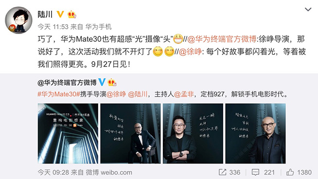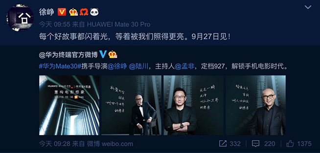 根據(jù)華為終端官方微博公布的消息,9月27日,華為Mate30系列將攜手著名導演徐崢、陸川和主持人孟非三位大咖,解鎖手機電影時代,并“重構(gòu)電影想象”。隨后三位大咖都轉(zhuǎn)發(fā)了該條微博,并進行互動。