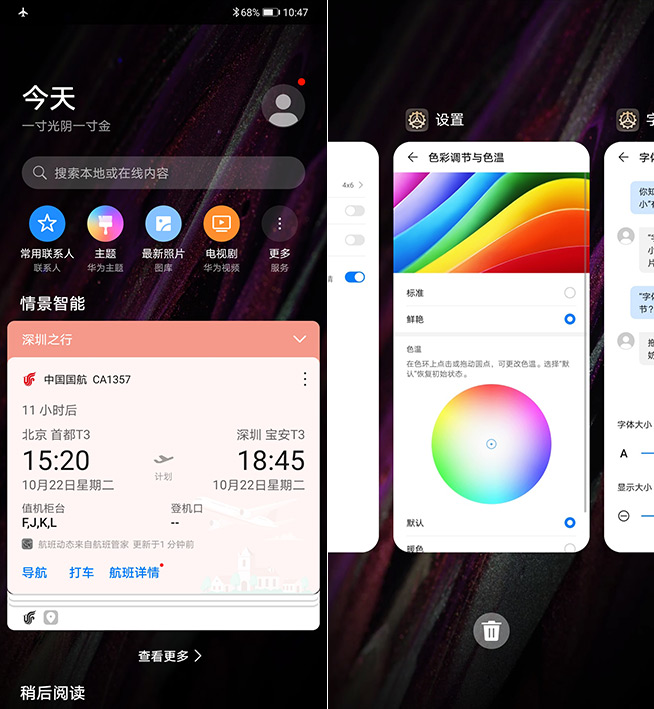 與此前已發(fā)布的華為Mate30一樣,華為Mate30 5G繼續(xù)采用6.62英寸OLED屏,提供DCI-P3廣色域,分辨率2340*1080像素。這一代機(jī)型豐富了色彩與護(hù)眼的設(shè)置選項,支持自然色彩顯示(即原彩功能),也有防頻閃的開關(guān)設(shè)置。