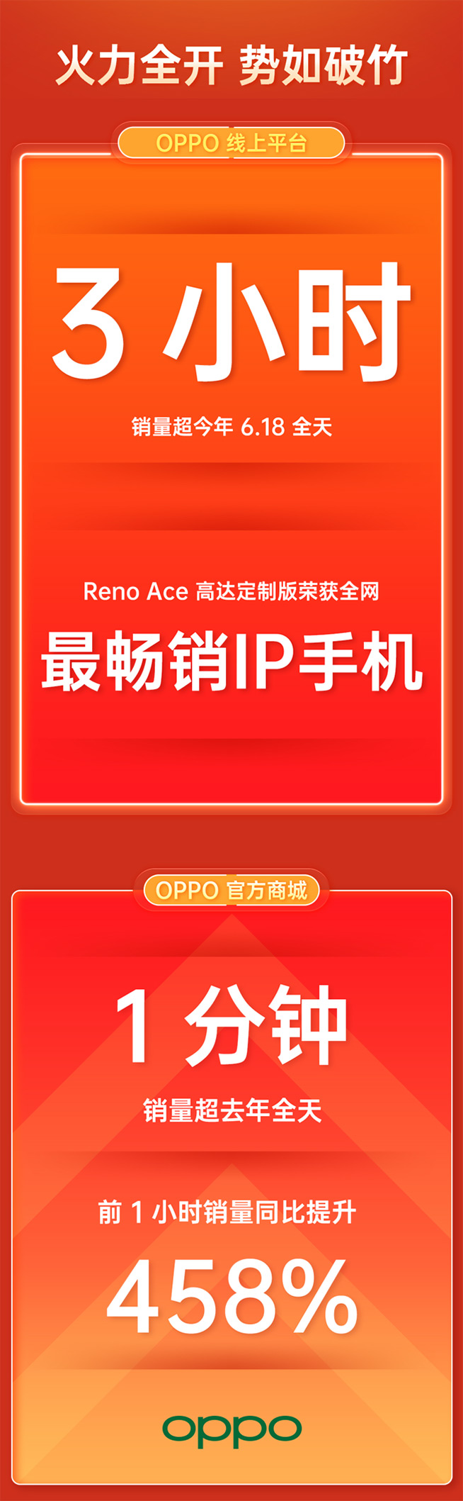 11月11日, OPPO廣東移動通信有限公司(以下簡稱:OPPO)電商平臺消息,OPPO線上平臺3小時銷量超今年618全天。官方商城1分鐘銷量超越去年雙11全天,前1小時銷量同比提升458%,Reno Ace高達版榮獲全網最暢銷IP手機。