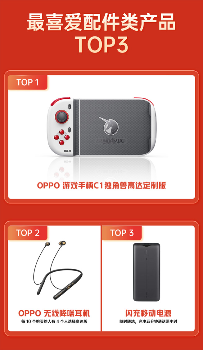 此外,OPPO游戲手柄C1獨角獸高達定制版、OPPO無線降噪耳機、閃充移動電源成為用戶最喜愛的配件產品TOP3。添加科客公眾號kekebat,獲取更多精彩資訊。