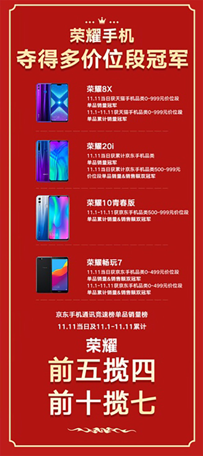 另外包括榮耀8X、榮耀20i、榮耀10青春版、榮耀暢玩7在內(nèi)的四款榮耀手機(jī)還奪得了天貓、京東兩大平臺(tái)當(dāng)中多個(gè)價(jià)位段的銷量和銷售額冠軍。火爆的人氣也反應(yīng)在了京東手機(jī)通訊競(jìng)速單品銷量榜當(dāng)中,據(jù)11.11當(dāng)日及11.1-11.11累計(jì)結(jié)果顯示,榮耀實(shí)現(xiàn)了前五攬四、前十?dāng)埰叩谋憩F(xiàn),霸榜實(shí)力一覽無(wú)余。