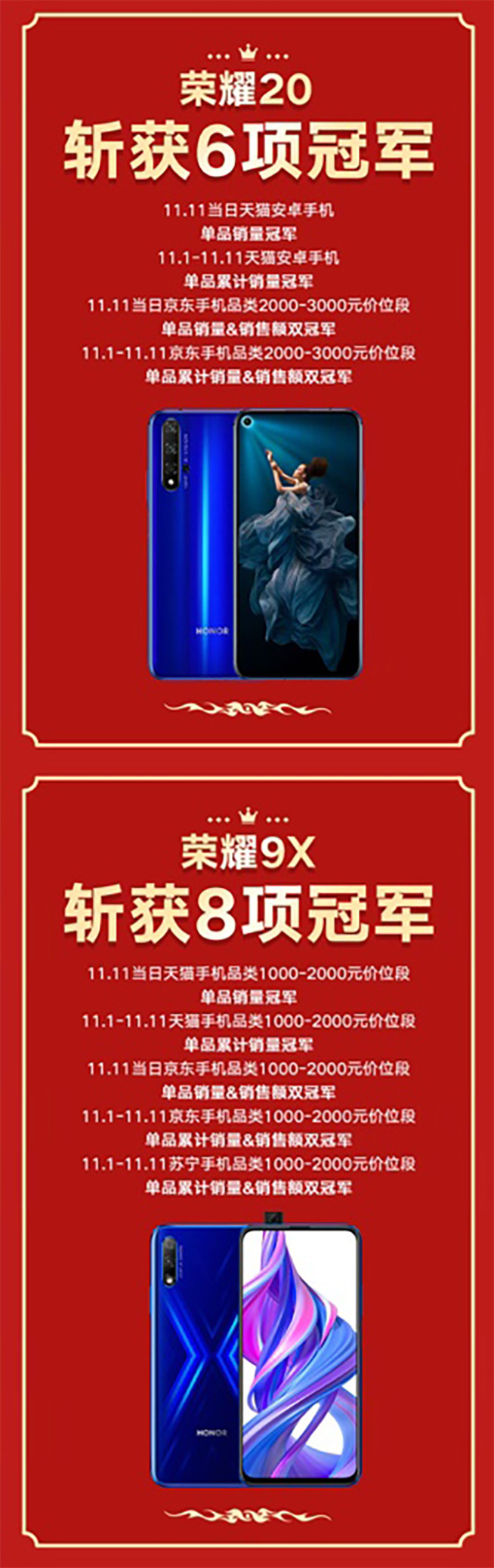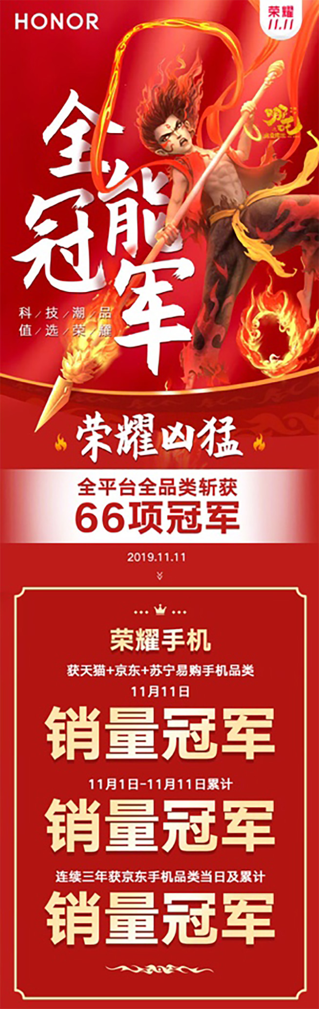 今年雙11,榮耀全平臺(tái)全品類狂攬66項(xiàng)冠軍,以兇猛之勢(shì)斬獲全能冠軍,完美收官2019年雙十一大促。