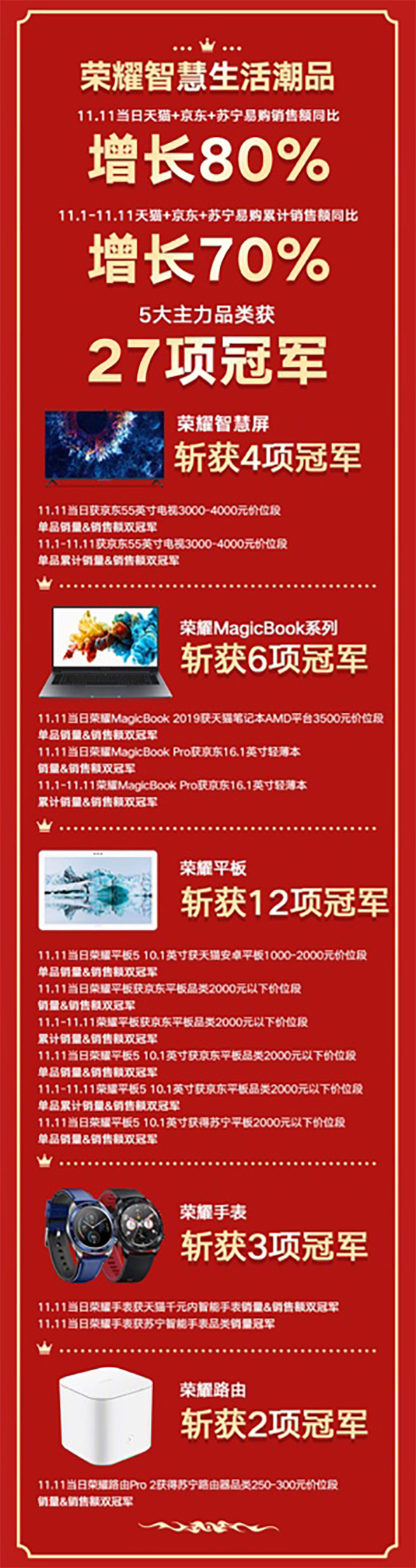 榮耀智慧生活潮品是今年雙十一期間又一亮點(diǎn),11.11當(dāng)日天貓+京東+蘇寧易購(gòu)銷售額同比增長(zhǎng)80%,11.1-11.11天貓+京東+蘇寧易購(gòu)累計(jì)銷售額同比增長(zhǎng)70%,5大主力品類斬獲27項(xiàng)冠軍。其中榮耀智慧屏分別收獲11.11當(dāng)日及11.1-11.11期間京東平臺(tái)55英寸電視3000-4000元檔位單品銷量&銷售額雙冠軍、單品累計(jì)銷量&銷售額雙冠軍。加上榮耀MagicBook系列斬獲6項(xiàng)冠軍、榮耀平板收獲12項(xiàng)冠軍、榮耀手表和榮耀路由共摘得5項(xiàng)冠軍,榮耀智慧生活潮品迎來(lái)全面爆發(fā)。