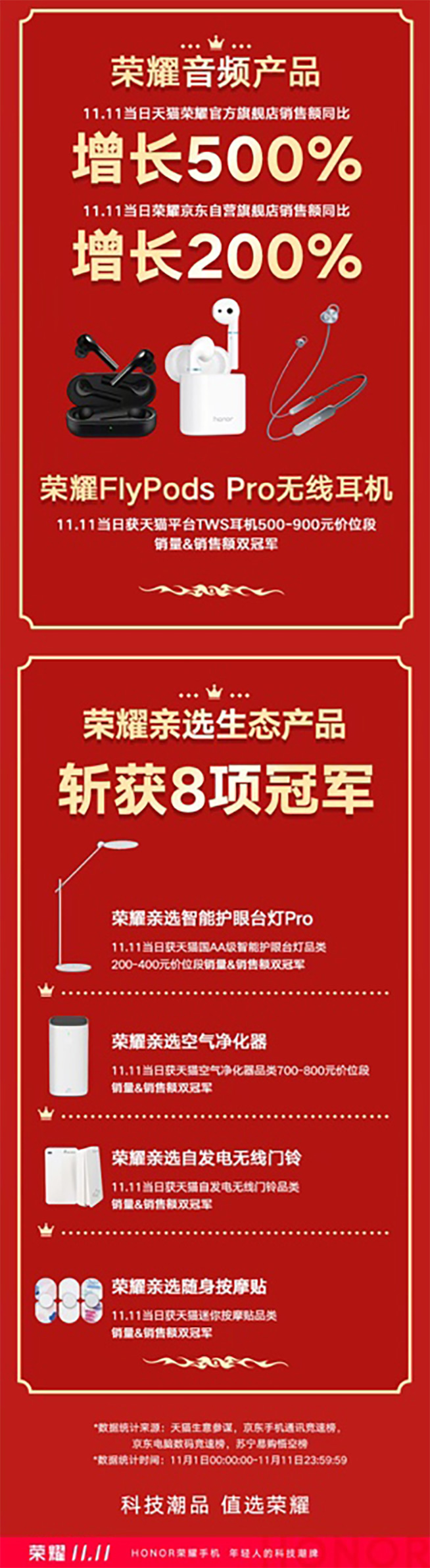 除此之外榮耀音頻產(chǎn)品和榮耀親選生態(tài)產(chǎn)品也表現(xiàn)搶眼。榮耀音頻產(chǎn)品在11.11當(dāng)日天貓榮耀官方旗艦店銷售額同比增長(zhǎng)500%,11.11當(dāng)日榮耀京東自營(yíng)旗艦店銷售額同比增長(zhǎng)200%。而榮耀FlyPods Pro無(wú)線耳機(jī)斬獲11.11當(dāng)日天貓平臺(tái)TWS耳機(jī)500-900價(jià)位段銷量和銷售額雙冠。親選生態(tài)產(chǎn)品方面,在榮耀親選nimova智能護(hù)眼臺(tái)燈Pro、榮耀親選空氣凈化器、榮耀親選自發(fā)電無(wú)線門鈴、榮耀親選隨身按摩貼四款產(chǎn)品銷量和銷售額頭名的助力下,共斬獲8項(xiàng)冠軍。
