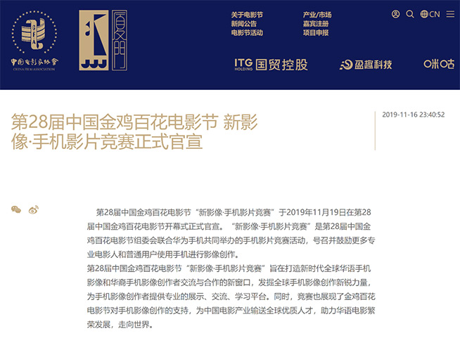 為發(fā)掘手機(jī)影像創(chuàng)作新銳力量,助力華語(yǔ)電影繁榮發(fā)展,2019年11月19日,第28屆中國(guó)金雞百花電影節(jié)“新影像·手機(jī)影片競(jìng)賽”正式官宣。這項(xiàng)賽事將于2019年11月至2020年3月31日征集參賽作品,并邀請(qǐng)多位業(yè)內(nèi)人士組建競(jìng)賽評(píng)委會(huì),計(jì)劃從2020年4月至2020年5月對(duì)參賽作品進(jìn)行專(zhuān)業(yè)評(píng)選。