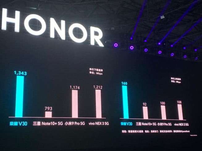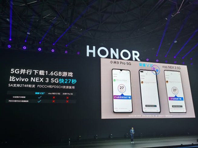 得益于華為自研麒麟990系列芯片的采用,榮耀V30系列擁有現(xiàn)階段領(lǐng)先的5G能力,除了眾所周知的獨占雙模5G之外,包括5G搜網(wǎng)、5G并行下行速率都比友商的5G方案更具優(yōu)勢,現(xiàn)場vivo NEX 3 5G多次成為背景板被比下去。