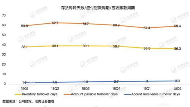 這之后,京東應(yīng)付賬款賬期略有下降,但據(jù)京東最新財(cái)報(bào)顯示,2019年Q3賬期仍然高達(dá)56.6天。