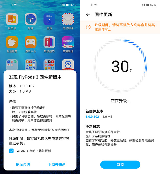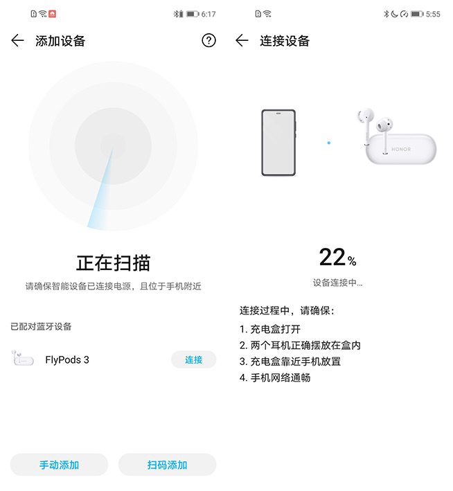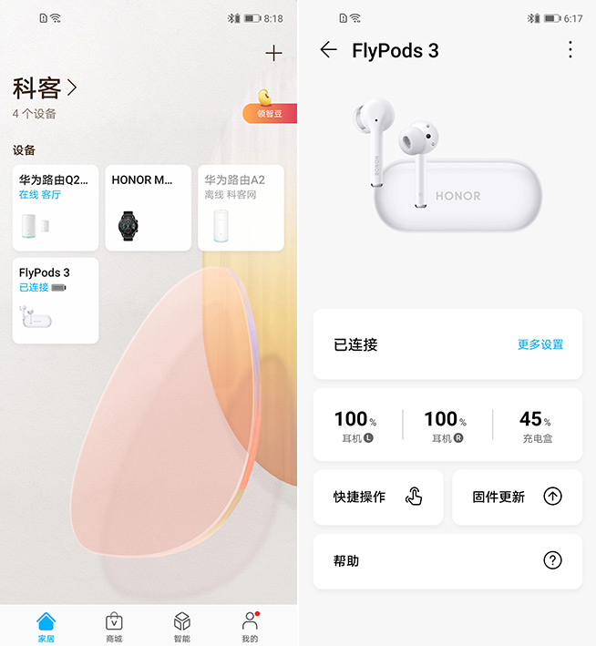 為方便調(diào)用榮耀FlyPods 3的完整功能,建議用戶下載智慧生活A(yù)pp使用,包括上面提到的快捷操作自定義、還有耳機(jī)固件升級(jí)、電池盒及左右耳機(jī)的實(shí)時(shí)剩余電量顯示等。如果是榮耀手機(jī)的用戶還可以通過藍(lán)牙內(nèi)的選項(xiàng)直接對(duì)耳機(jī)進(jìn)行設(shè)置。?