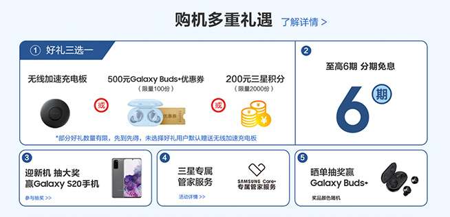 此次三星Galaxy S20 5G系列預(yù)售活動(dòng)為廣大消費(fèi)者準(zhǔn)備了諸多好禮,即刻參與預(yù)約,就有機(jī)會(huì)享受超大力度的優(yōu)惠。自3月6日起至3月19日,成功在三星網(wǎng)上商城預(yù)約且購買三星Galaxy S20 5G系列的消費(fèi)者,即有機(jī)會(huì)獲得好禮三選一福利,消費(fèi)者可在無線加速充電板、Galaxy Buds+ 500元優(yōu)惠券或價(jià)值200元的三星積分中任選其一,數(shù)量有限,先到先得。除此之外,消費(fèi)者還可享受三星專屬管家服務(wù),包括6個(gè)月優(yōu)惠換屏服務(wù)、12個(gè)月內(nèi)免費(fèi)電池性能檢測及優(yōu)化服務(wù)、18個(gè)月5折更換電池服務(wù)、以及24小時(shí)VIP熱線。同時(shí),還有至高6期免息分期以及其他驚喜福利。